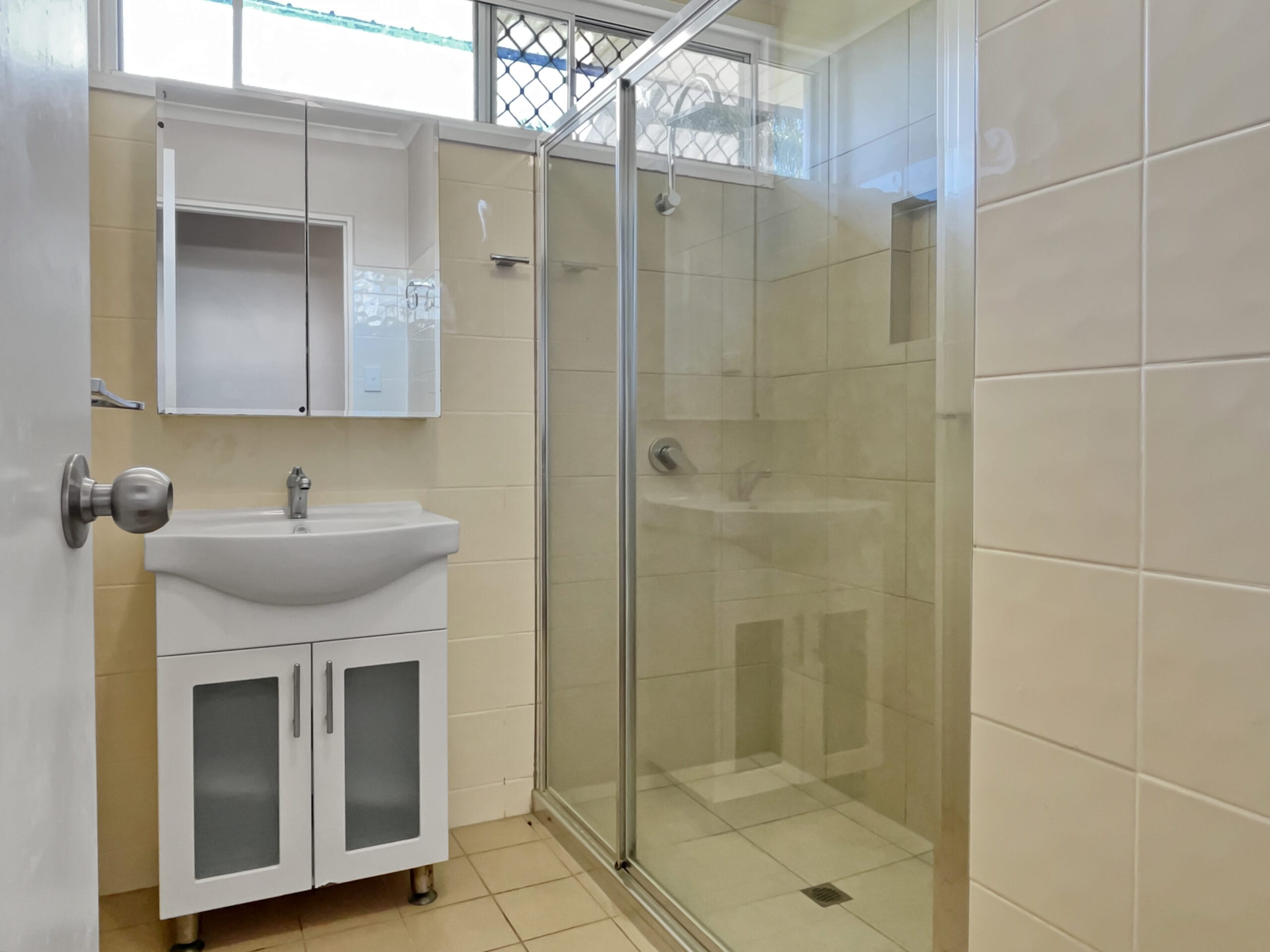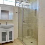 Bathroom has late model walk in shower recess with glass screen,