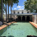 Huge family living area with polished concrete floors leads out to covered patio & pool,